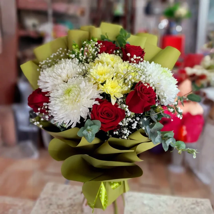 Этот шикарный букет воплощает в себе красоту и изысканность. Кустовые и одноголовые хризантемы великолепно сочетаются с нежными розами и украшены изящными веточками гипсофилы. Вся композиция окутана элегантной упаковкой, которая добавляет шарма и завершает впечатление. Это великолепное произведение природы и искусства, которое обязательно произведет глубокое впечатление на любого получателя.