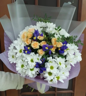 Великолепный букет собран в увлекательной комбинации кустовых хризантем, ярких ирисов и кустовых роз. Этот букет ярких цветов станет незабываемым подарком для особенных моментов жизни. Каждый цветок в этом букете переплетается с другим, создавая впечатляющий и запоминающийся образ. Благородная крафтовая упаковка подчеркивает естественность и элегантность данного букета.